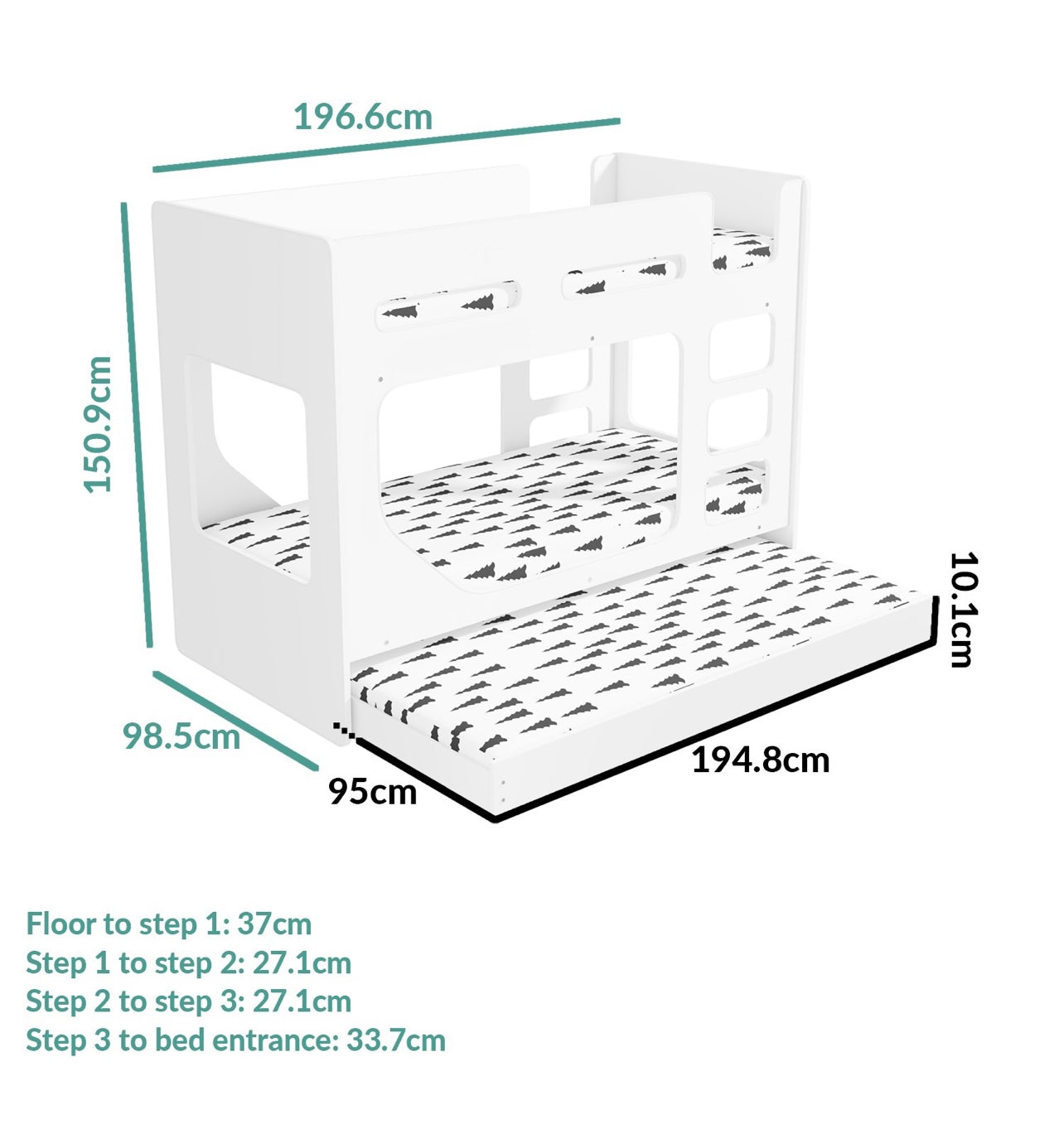 - Max weight limit for the top bunk, bottom bunk and trundle base including mattress: 120 kg