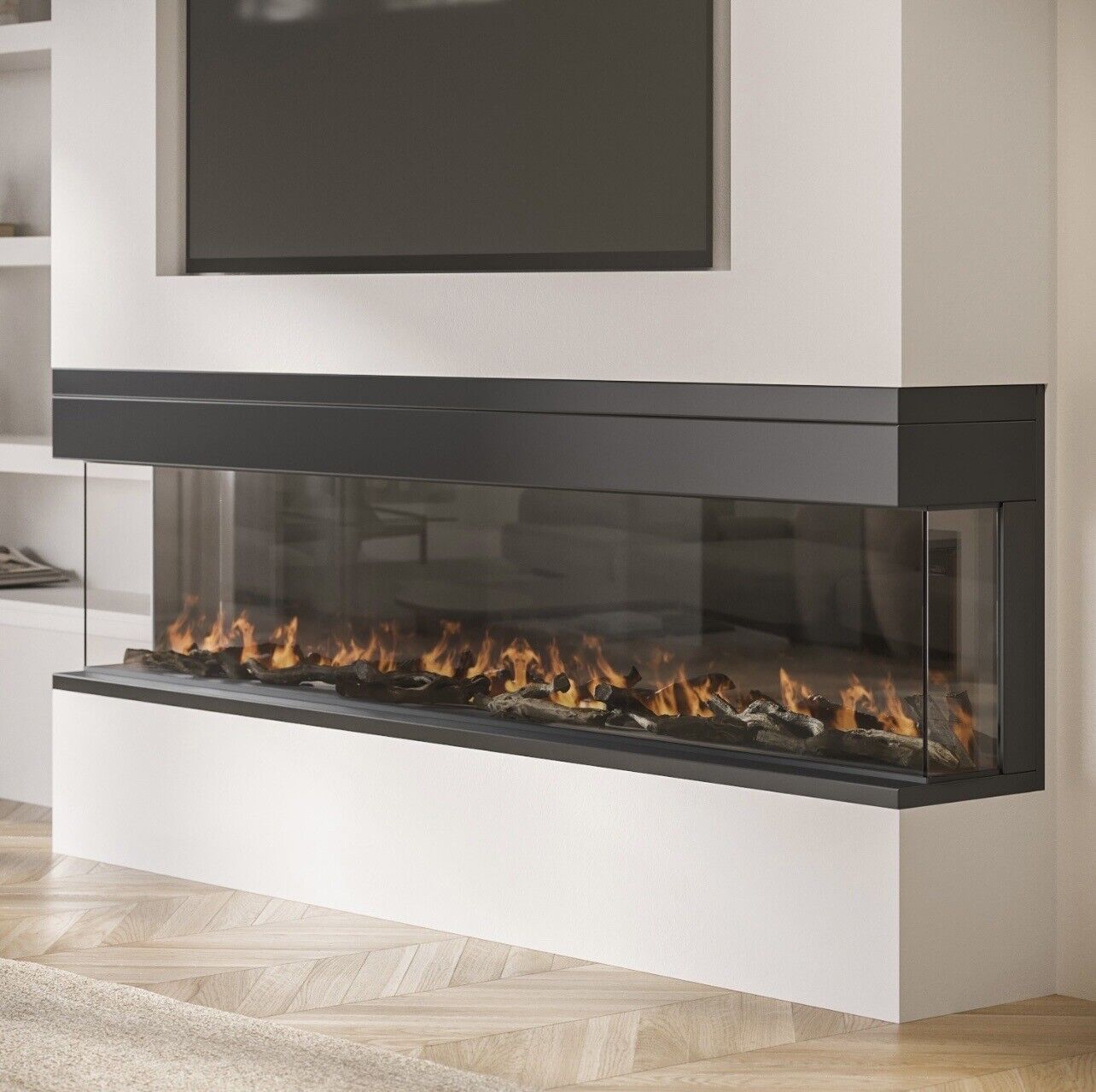 With realistic and adjustable flickering flames and an authentic log bed with a choice of colour options and brightness, this stylish media wall fire enables you to create the perfect ambience. You can set the daily timer to set your fire to turn on, ready for when you get home. Once the temperature drops from an open window or door, the fire turns off to save energy, plus there’s even an automatic shut-off feature to prevent overheating. Make changes from the comfort of your sofa with the remote or the discreet controls on the fire. Why not use the innovative technology it has to offer and connect to your smartphone or even Alexa or Google? This electric fire would make a great addition to a media wall and can be fixed flush or recessed for a sleeker, in-depth look. Once it's plugged in, it’s ready to use.